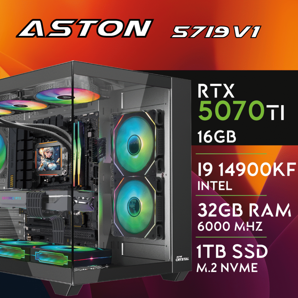 Computador Gaming ASTON-57i9V1 I9 14900KF 32GB 1TB M.2 SSD RTX5070Ti 16GB 3D VIEW CASE Watercooling 360mm IPS LCD