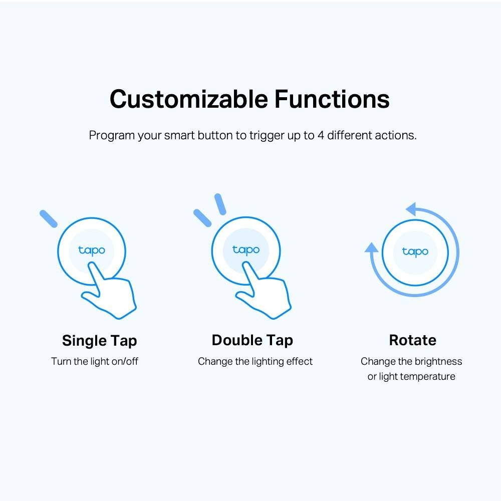 Programe o seu botão inteligente para acionar até 4 ações diferentes com controlos simples, duplos e giratórios.