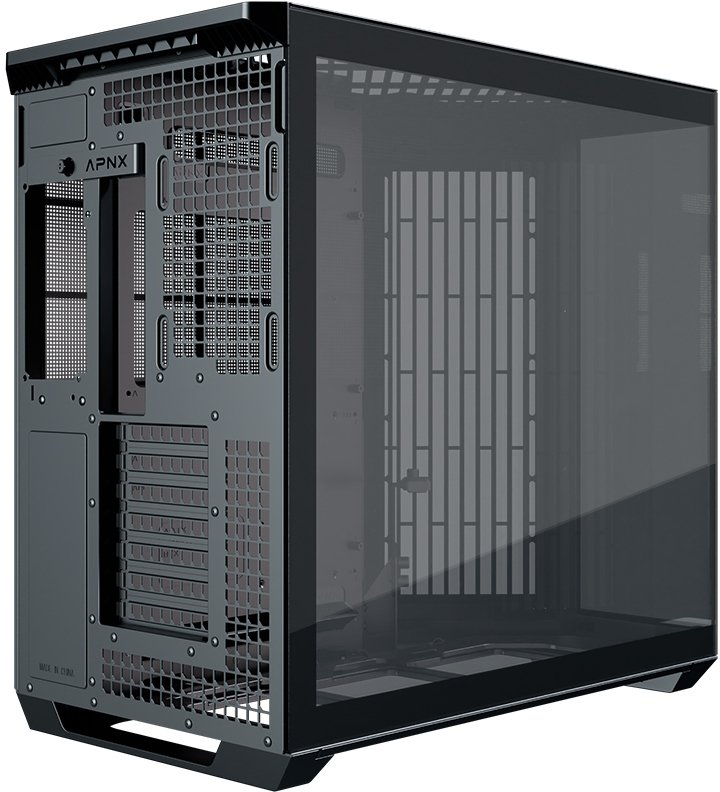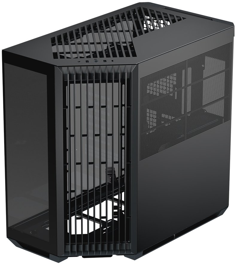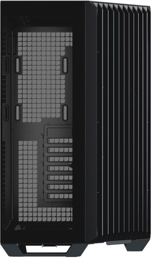 Os designs panorâmicos de câmara dupla padrão costumam colocar as ranhuras das ventoinhas laterais ao lado da motherboard, mas esta configuração não resulta num fluxo de ar eficiente através da caixa. Ao rodar o ângulo de entrada de ar de 90° para 45°, o design inovador melhora o fluxo de ar geral e a eficiência térmica, tanto para a GPU como para a CPU, mantendo ao mesmo tempo, a vista característica de uma caixa panorâmica.