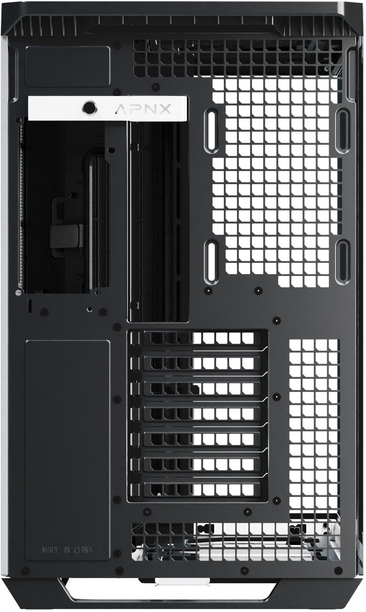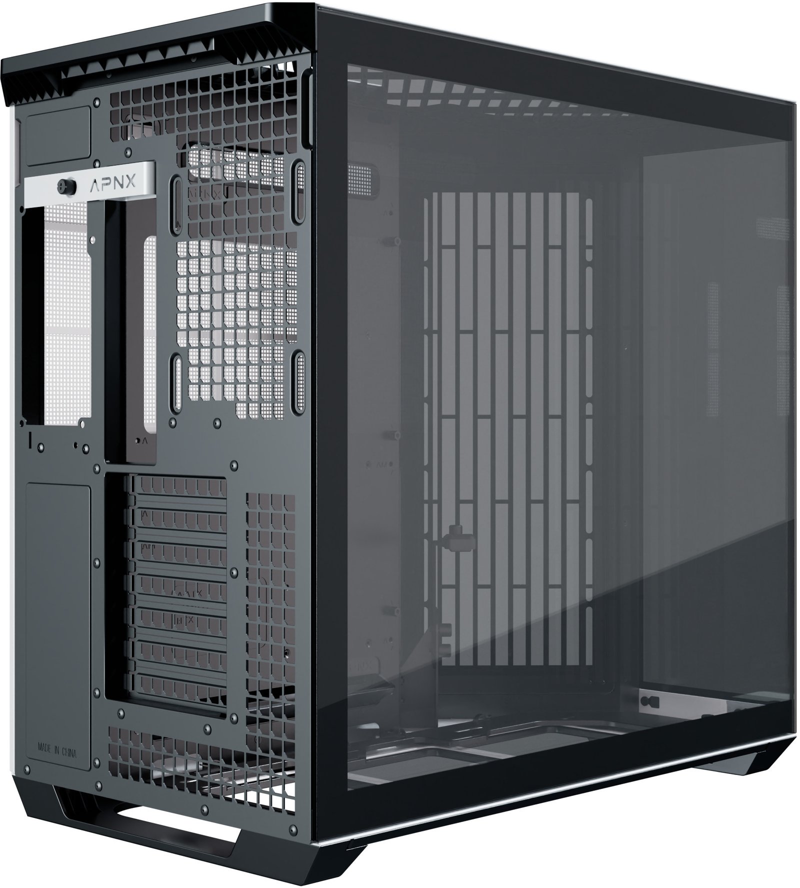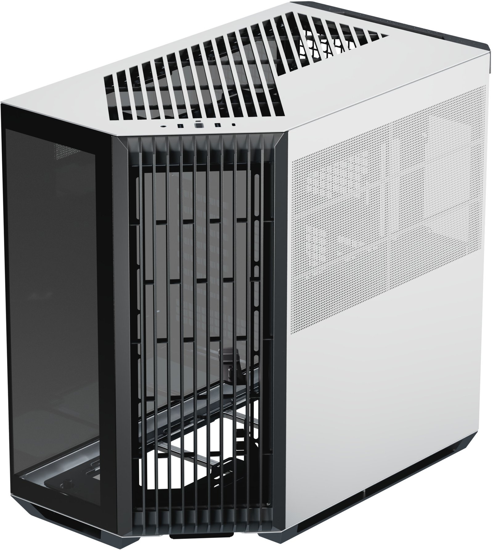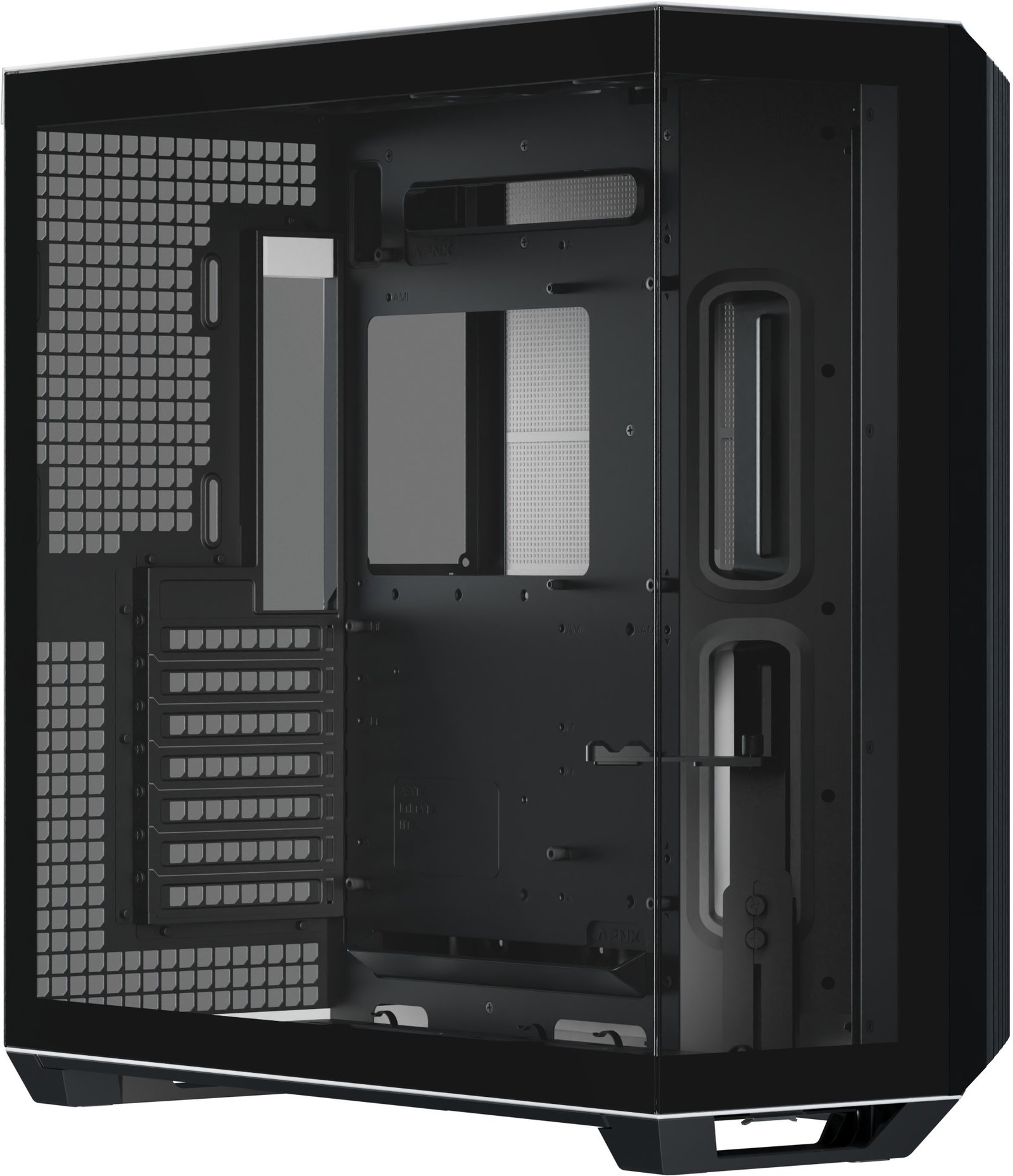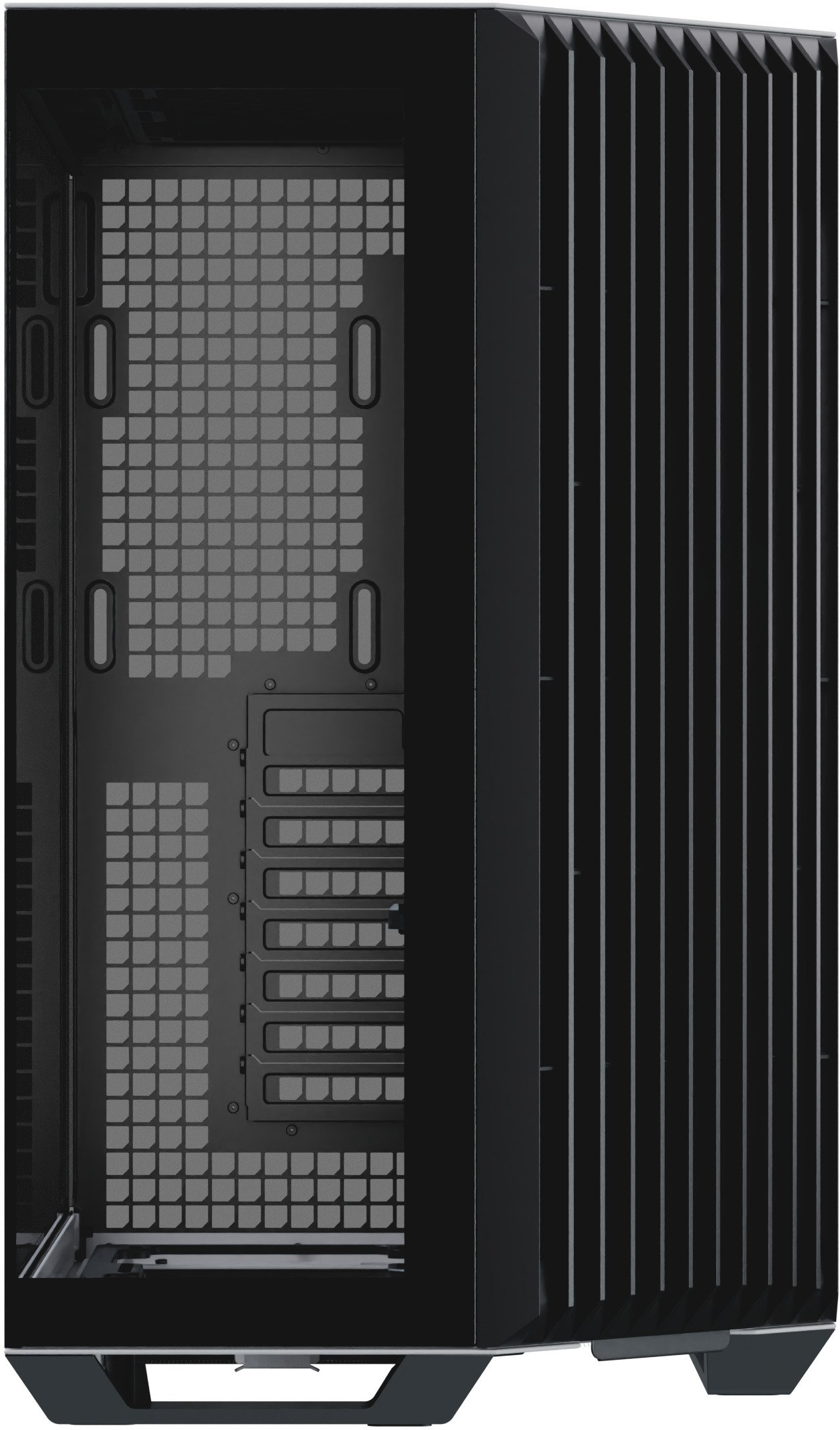 Os designs panorâmicos de câmara dupla padrão costumam colocar as ranhuras das ventoinhas laterais ao lado da motherboard, mas esta configuração não resulta num fluxo de ar eficiente através da caixa. Ao rodar o ângulo de entrada de ar de 90° para 45°, o design inovador melhora o fluxo de ar geral e a eficiência térmica, tanto para a GPU como para a CPU, mantendo ao mesmo tempo, a vista característica de uma caixa panorâmica.