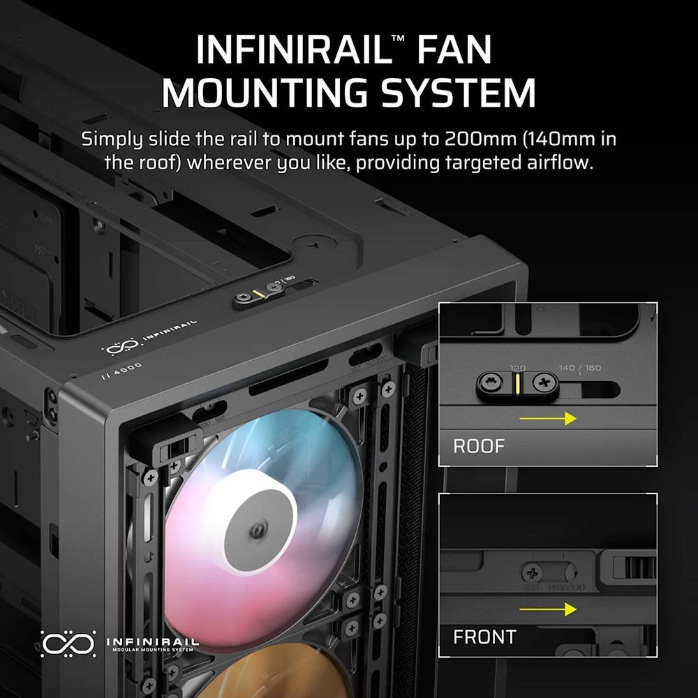 Esse sistema de instalação de aço em vários pontos oferece uma flexibilidade incomparável na configuração das ventoinhas nas partes frontal e superior. Basta deslizar o trilho para montar ventoinhas de até 200mm (140mm na parte superior) exatamente onde desejar, promovendo um fluxo de ar direcionado sem limitações de pontos fixos de montagem.