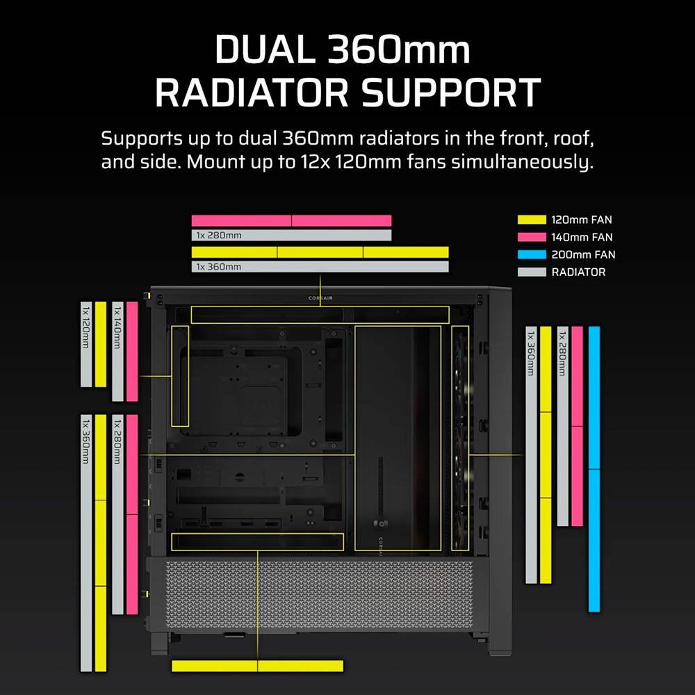 Aumente a refrigeração da sua máquina com três locais dedicados de montagem para radiadores de 360mm: frontal, superior e lateral. Pode montar até 10 ventoinhas de 120mm simultaneamente, garantindo uma entrada contínua de ar resfriado e uma exaustão eficiente de ar quente.