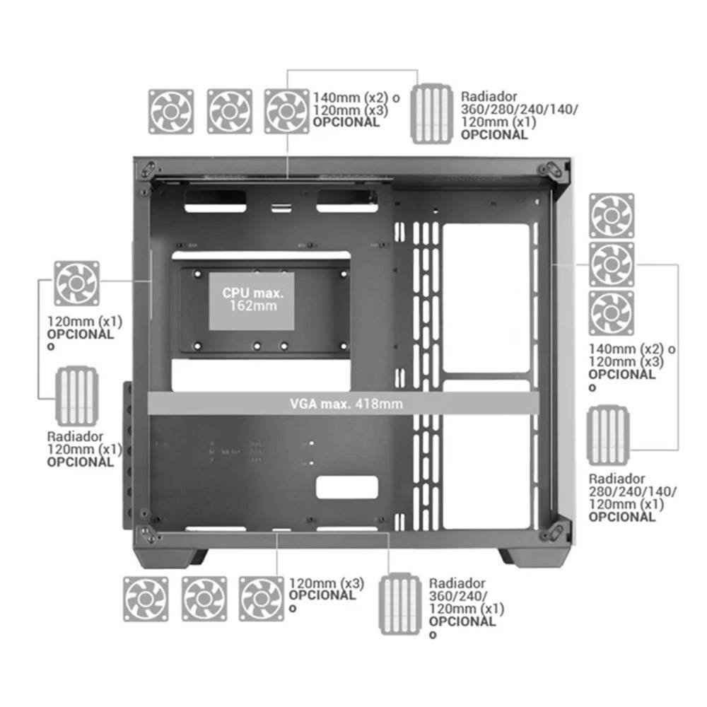 Vidro temperado contínuo sem moldura, tamanho XXL E-ATX para as configurações mais exclusivas. Com suporte para até 10 ventiladores e triplo arrefecimento líquido em várias posições.