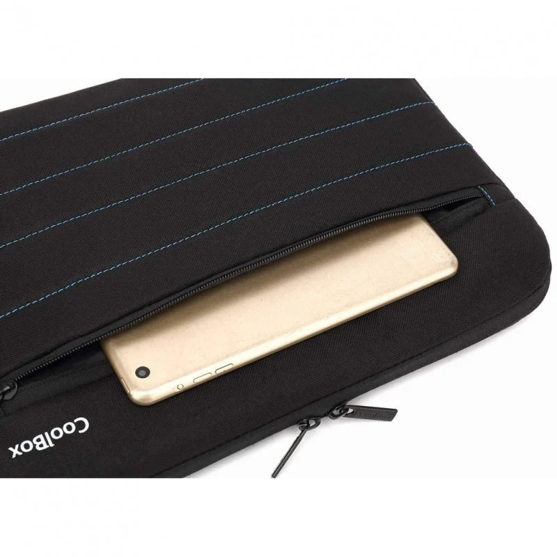 A mala CoolBox é adequada para computadores portáteis ou netbooks de 13” e tablets de tamanho compatível. Forro adequado para proteger o netbook ou tablet no interior Tecido impermeável para manter o dispositivo guardado no interior seguro em caso de derrame de bebidas na manga. Design simples, discreto e elegante em preto com pormenores em azul.