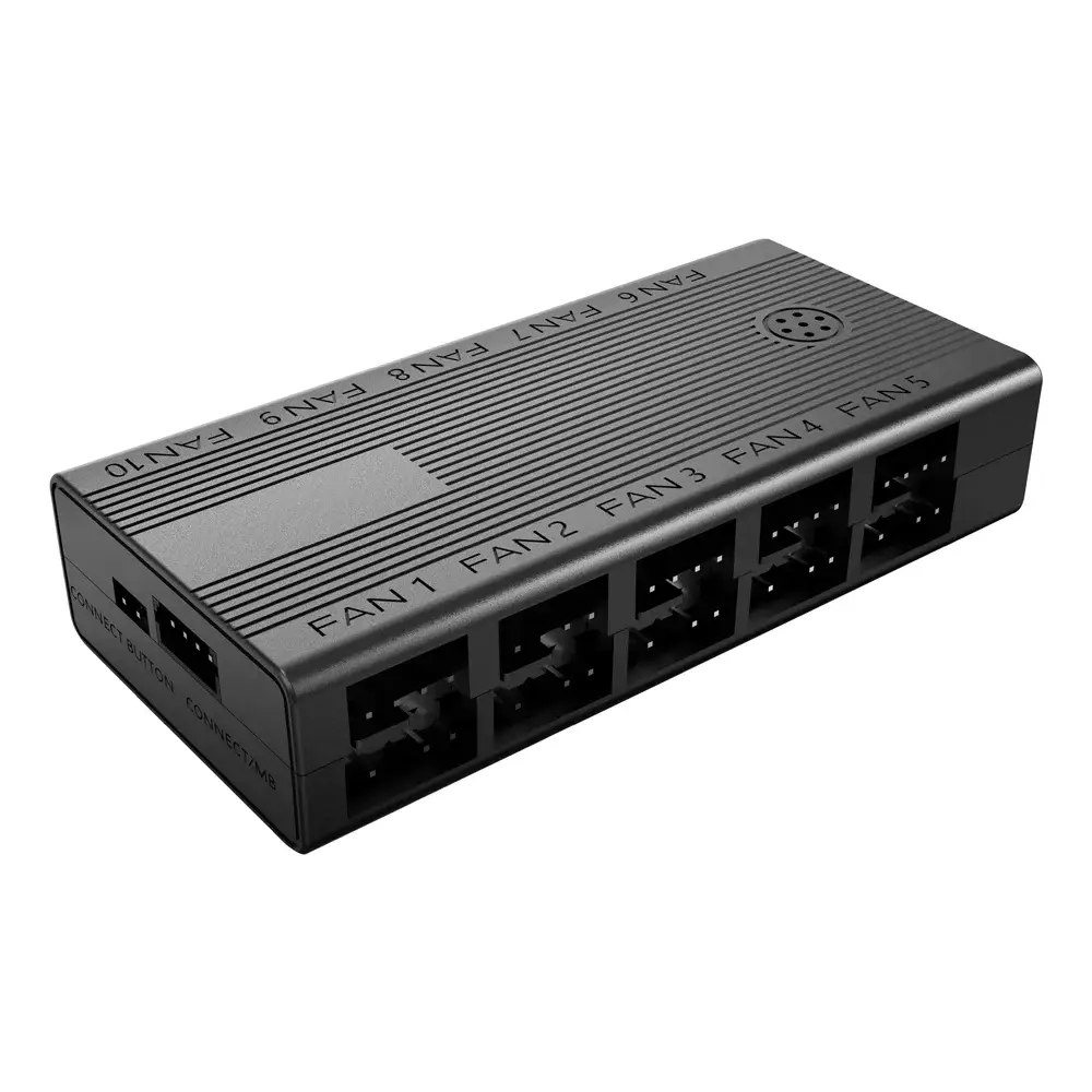 O MF-HUB Control Hub combina o controlo completo da refrigeração e da iluminação da sua configuração num único dispositivo. Possui 10 portas compatíveis com PWM para ventoinhas e 10 portas para dispositivos de iluminação compatíveis com ARGB, permitindo-lhe ligar e controlar ventoinhas e componentes de iluminação com facilidade. Graças ao seu controlo remoto, pode ajustar instantaneamente os efeitos ARGB e as velocidades dos ventiladores (600–1600 RPM). Além disso, suporta as principais placas-mãe ARGB, proporcionando uma integração perfeita e uma estética unificada em qualquer configuração. Alimentação centralizada. Iluminação sincronizada. Controlo máximo.