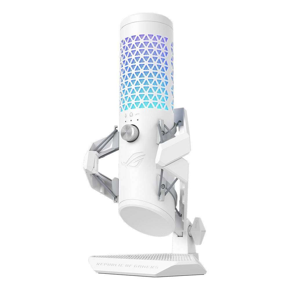 O microfone de condensador cardioide profissional para jogos inclui uma cápsula de condensador de 25 mm de qualidade de estúdio, uma taxa de amostragem de 192 kHz / 24 bits, um filtro passa-alto, um filtro pop incorporado, um suporte de choque em metal de primeira qualidade e iluminação ASUS Aura Sync RGB.