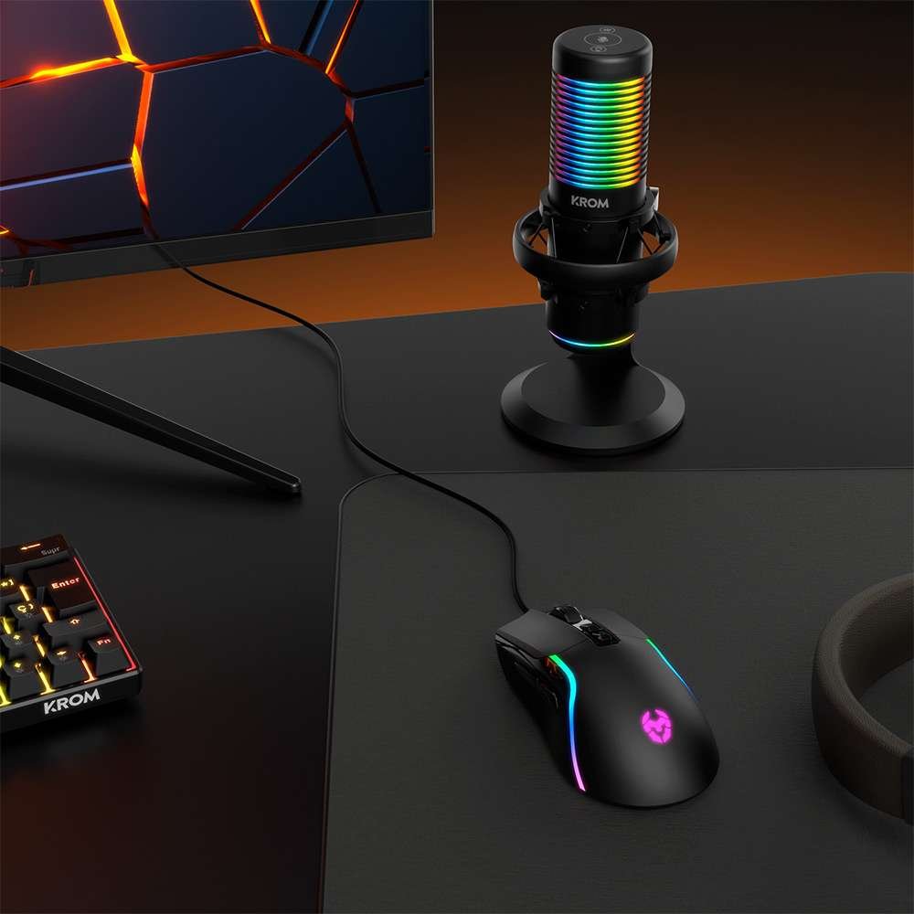 O Krom Kaze é um microfone de condensador duplo com qualidade de estúdio HD e suporte anti-choque, com o qual obterá o melhor som nas suas transmissões, podcasts, conversas ou gravações de música.