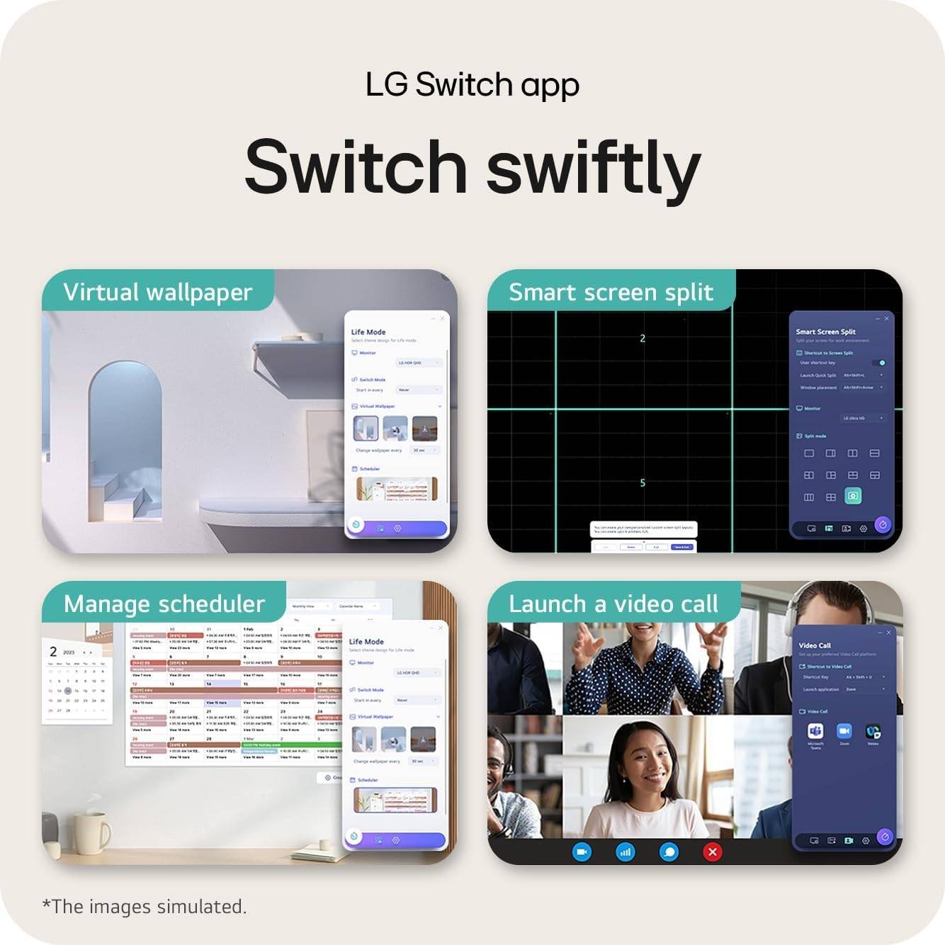 A aplicação LG Switch ajuda a otimizar o monitor para o seu trabalho e vida pessoal. Pode facilmente dividir o ecrã inteiro até 6, alterar o design do tema ou até mesmo iniciar uma plataforma de videochamada com uma tecla de atalho mapeada.