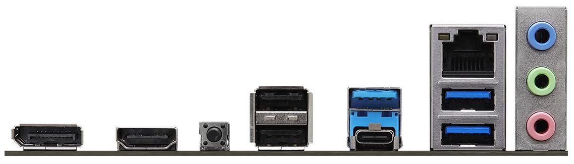 | Portas Traseiras | 2 x Antenna Mounting Points 1 x HDMI 1 x DisplayPort 1.4 1 x USB 3.2 Gen1 Type-C 3 x USB 3.2 Gen1 Type-A 2 x USB 2.0 1 x RJ-45 1 x Botão BIOS Flashback HD Audio Jacks: Line in / Front Speaker / Microphone |
