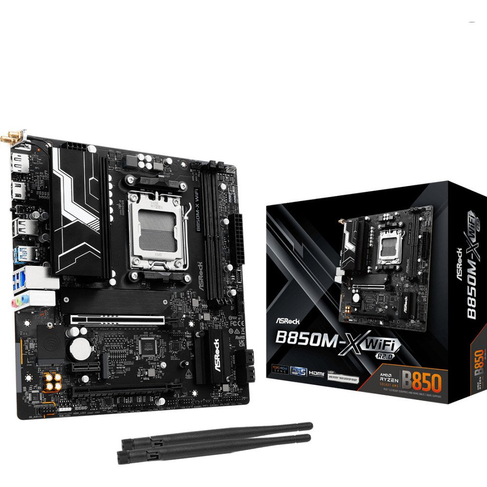 Asrock B850M-X WiFi R2.0. Fabricante do processador: AMD, Socket do processador: Ranhura AM5, Processador: AMD Ryzen 7000 Series, AMD Ryzen 8000 Series, AMD Ryzen 9000 Series. Tipos de memórias compatíveis: DDR5-SDRAM, Memória interna máxima: 128 GB, Tipo de ranhuras de memória: DIMM. Interfaces de armazenamento suportadas: M.2, SATA III, Tipos de unidade de armazenamento suportados: HDD & SSD, Níveis RAID: 0, 1, 10. Tipo de interface ethernet: 2.5 Gigabit Ethernet, Controlador LAN: Dragon RTL8125BG, Padrão Wi-Fi máximo: Wi-Fi 6E (802.11ax). Componente para: PC, Forma da motherboard: micro ATX, Família de chipset da placa-mãe: AMD