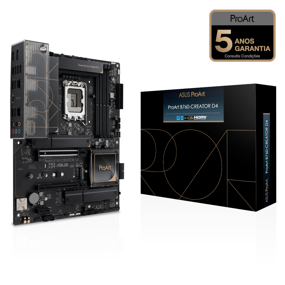 A ProArt B760-Creator D4 é uma motherboard melhorada concebida para cargas de trabalho de criação de conteúdos como produção virtual, renderização 3D e edição de vídeo 4K/8K. Liberta o desempenho dos processadores Intel® Core™ da 13ª e 12ª geração através de um design robusto de fornecimento de energia e refrigeração, e a sua conectividade abrangente inclui três ranhuras M.2, 2.5 Gb e 1 Gb Ethernet, um conector USB 3.2 Gen 2×2 Type-C® do painel frontal e um cabeçalho ThunderboltTM 4.