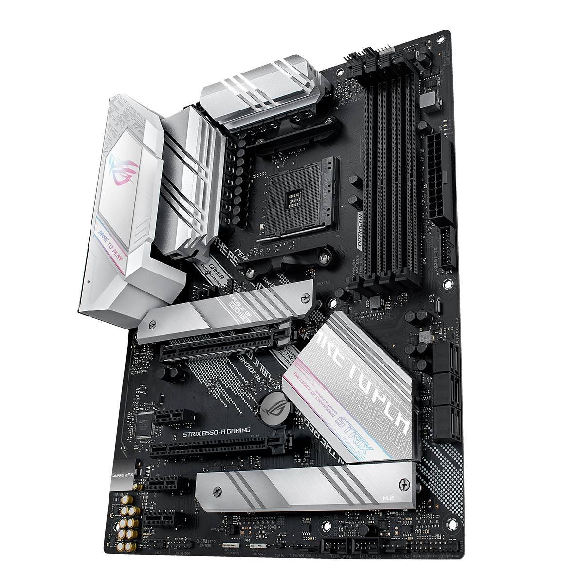 ROG Strix B550-A Gaming fornece entrega robusta de energia para alimentar os núcleos de Ryzen, arrefecimento abrangente e suporte para memória mais rápida – portanto, tem tudo o que precisa para carregar a sua construção com componentes de alto desempenho para jogar nas grandes ligas.