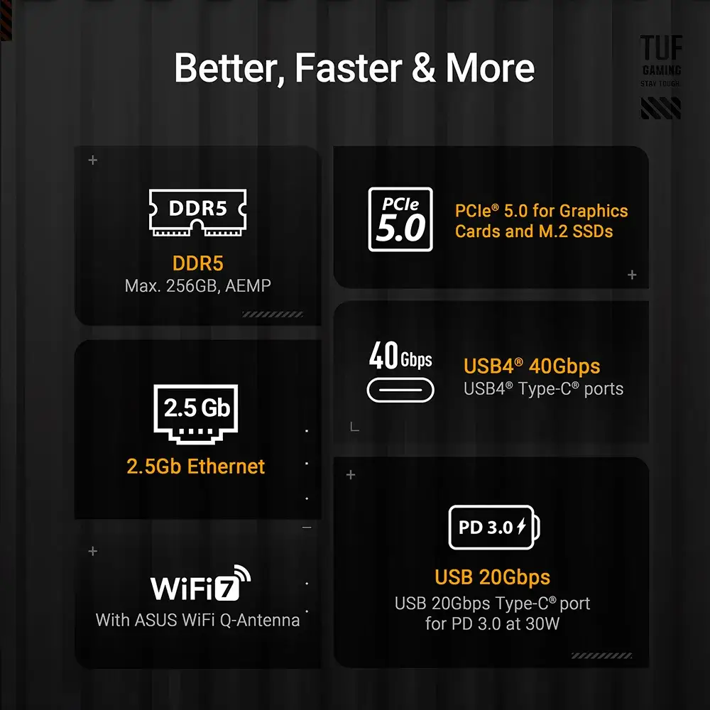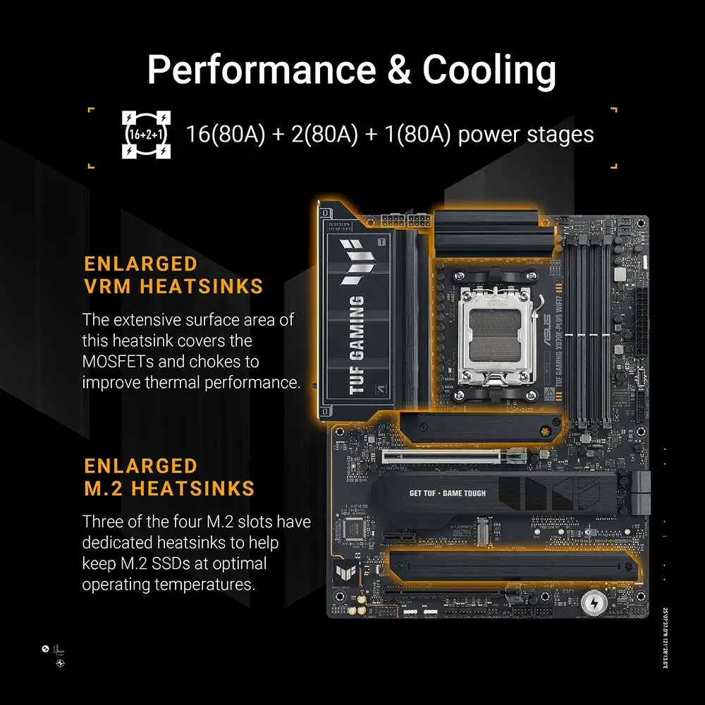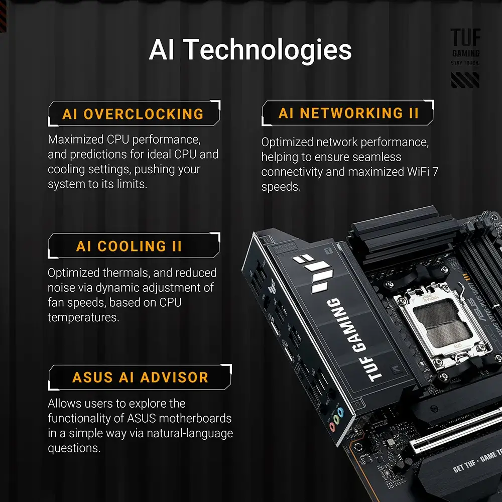 A ASUS TUF GAMING X870E-PLUS WIFI7 reúne em todos os elementos essenciais dos mais recentes processadores AMD Ryzen™ e combina-os com funcionalidades prontas para jogos e durabilidade comprovada. Concebida com componentes de nível militar, uma solução de alimentação melhorada e um sistema de arrefecimento abrangente, esta motherboard vai além das expectativas com um desempenho sólido e estável para maratonas de jogos. As motherboards TUF GAMING também passam por rigorosos testes de resistência para garantir que possam lidar com condições em que outras podem falhar. Esta plataforma fornece a potência e a conectividade que as aplicações avançadas de IA para PC exigem.