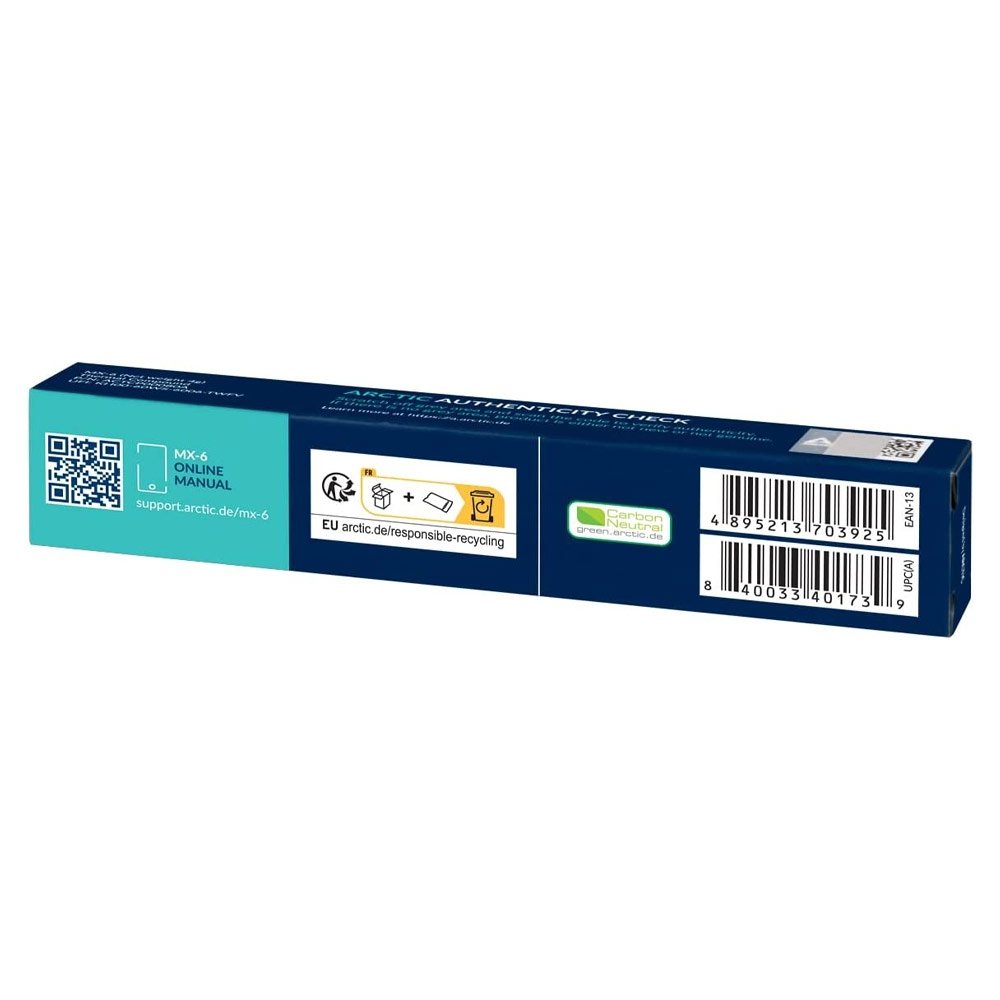 A MX-6 apresenta baixa resistência térmica e é fácil de aplicar e seguro de usar, assegurando uma dissipação de calor fiável durante longos períodos de tempo. É adequado para todas as CPUs de PC, portáteis ou consolas e GPUs, bem como para circuitos integrados.