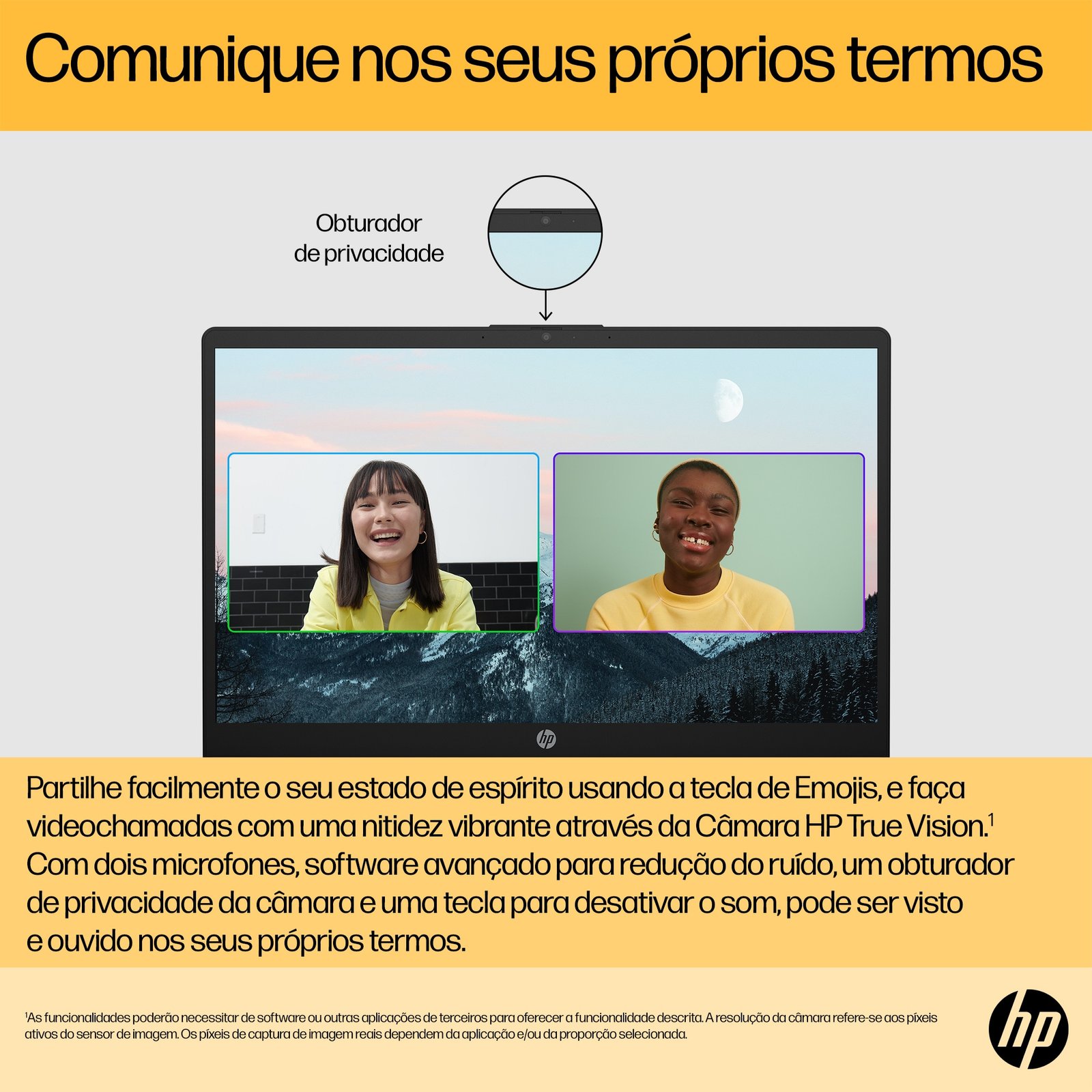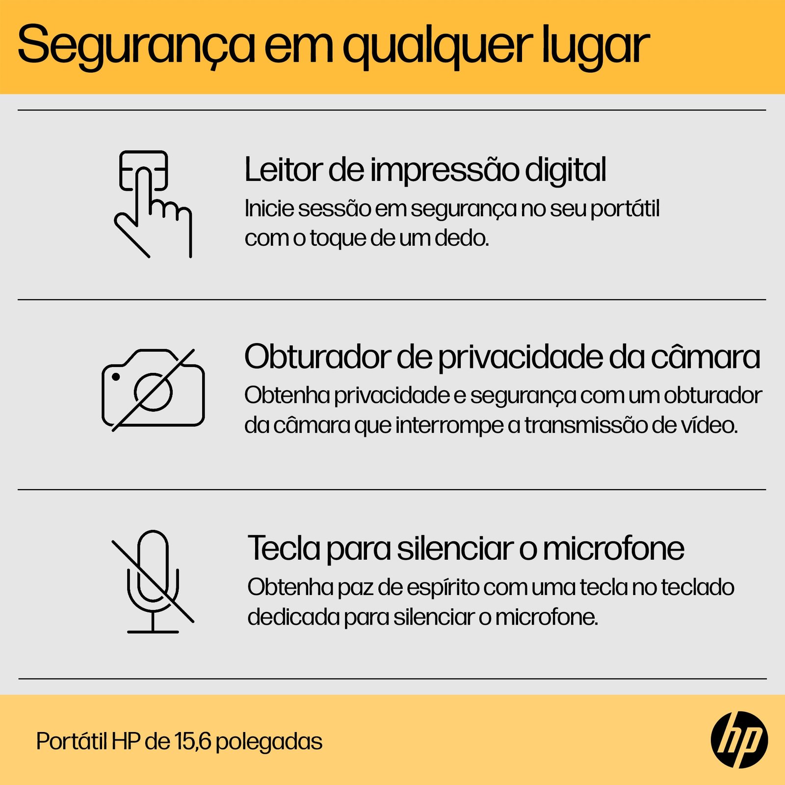 | HP Security tools | Tecla para silenciar o microfone; Obturador de privacidade da câmara; Suporte para Trusted Platform Module (firmware TPM) |