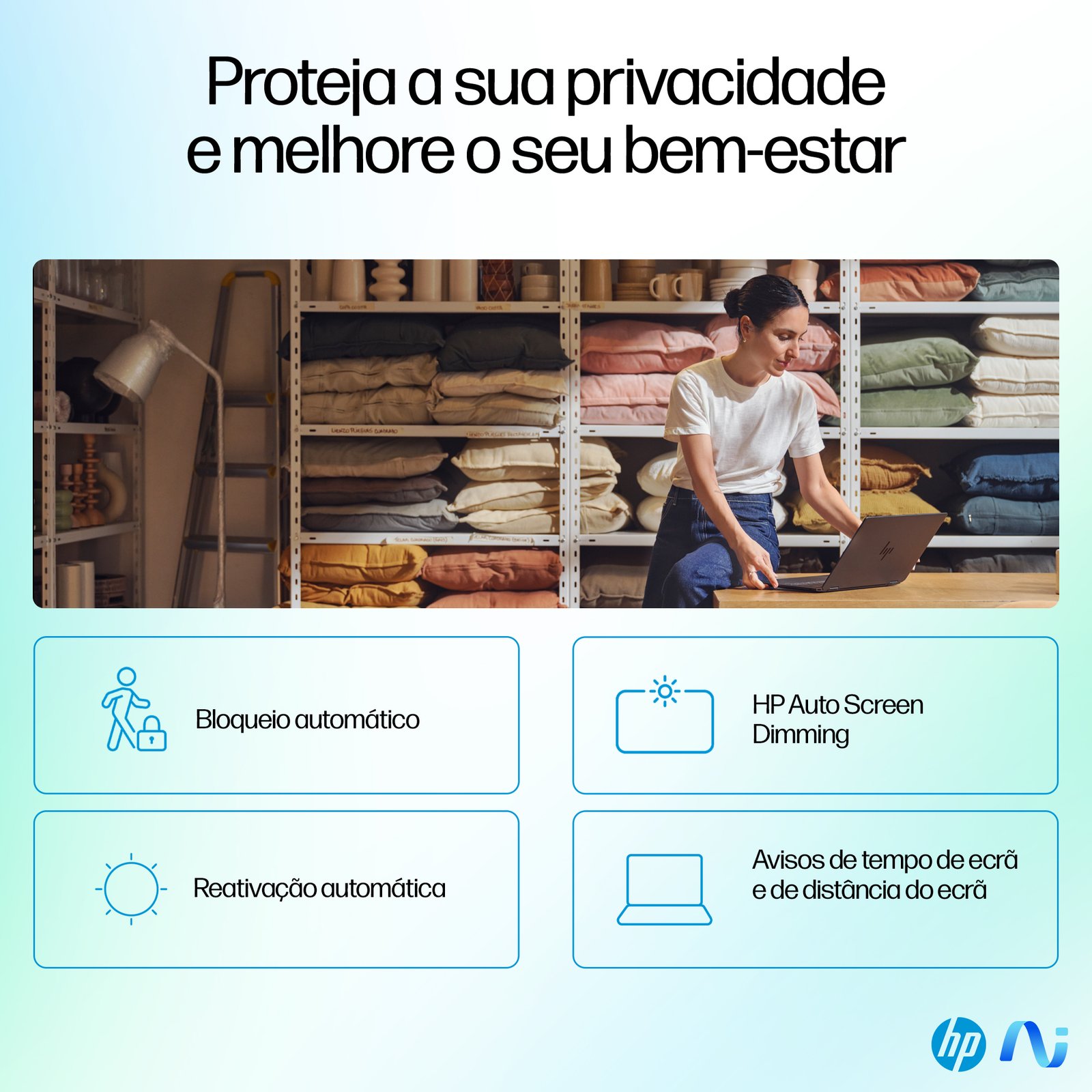 Gestão de segurança | Tecla para silenciar o microfone; Obturador de privacidade da câmara |