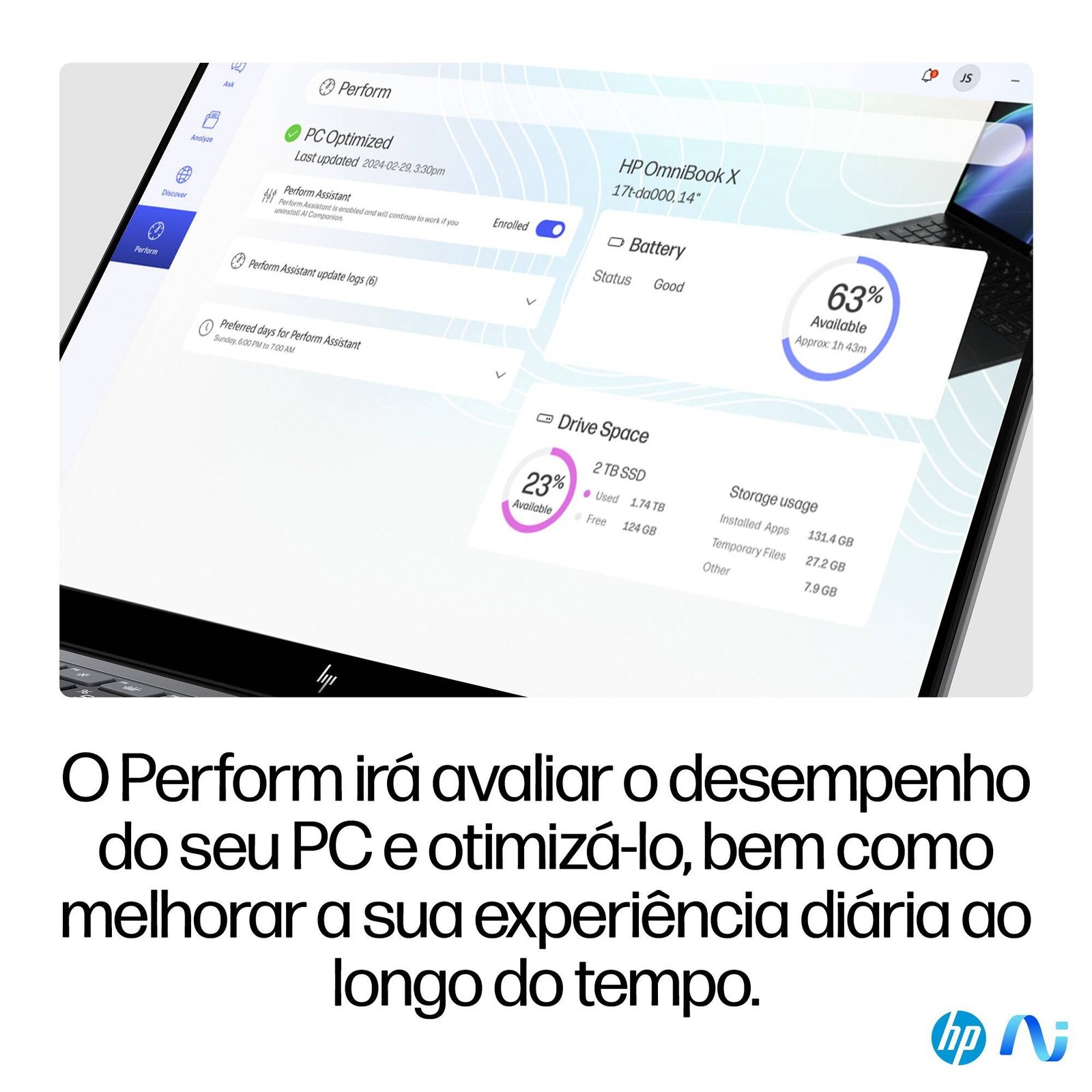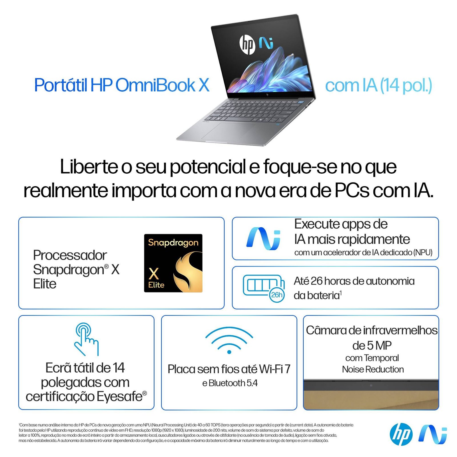 Equipado com o Snapdragon® X Elite, um motor de IA com NPU dedicada e uma autonomia da bateria de até 26 horas, o HP OmniBook X com IA irá elevar o seu nível de produtividade personalizada. Uma câmara de 5 MP com Windows Studio Effects e as melhores ferramentas de colaboração irão melhorar a sua comunicação sem interrupções.