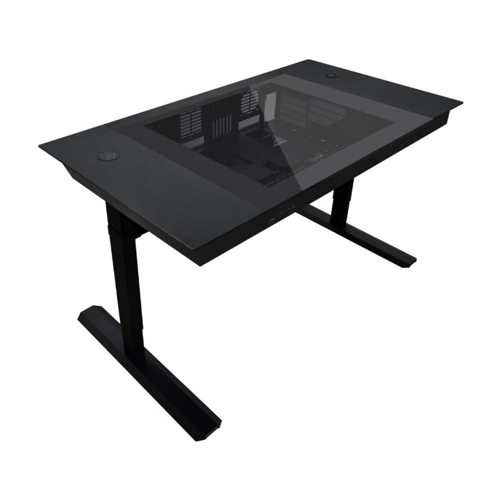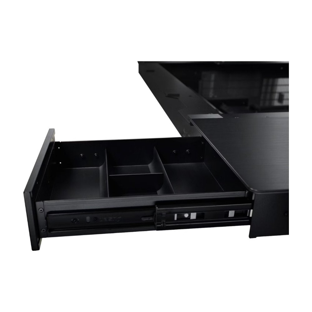 A modularidade eleva-se ao permitir motherboards até E-ATX, duas fontes ATX, placas gráficas até 383mm, radiadores líquidos até 480mm e até 17 ventoinhas em simultâneo, tornando possível arrefecimento extremo ou uso massivo de discos (até 16 HDD/SSD). A secretária possui tabuleiros modulares, excelente gestão de cabos, dois sistemas completos de I/O frontal para fácil acesso às múltiplas portas USB-C, USB-A e áudio, além de acabamento premium em aço, alumínio e vidro temperado de 6mm.