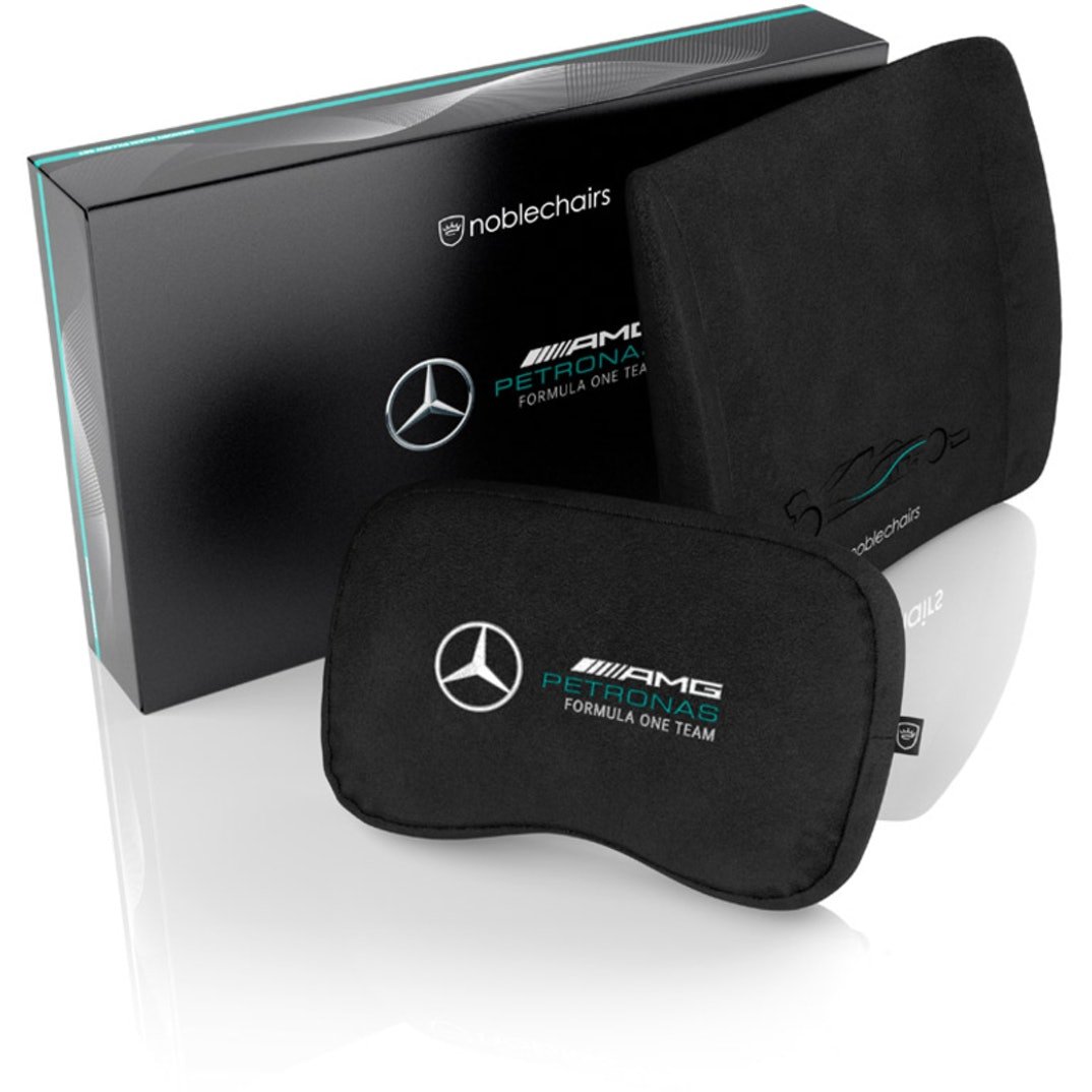 As almofadas são cobertas com uma capa de poliéster macio, resistente e respirável. Ao mesmo tempo, a cobertura é fácil de cuidar e pode ser limpa facilmente, mesmo numa máquina de lavar roupa. Cuidados e conforto à parte, as almofadas noblechairs também não carecem no departamento de estética: elas incluem o famoso logótipo bordado da equipa de Fórmula 1 da Mercedes.
