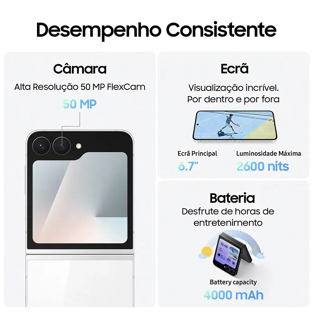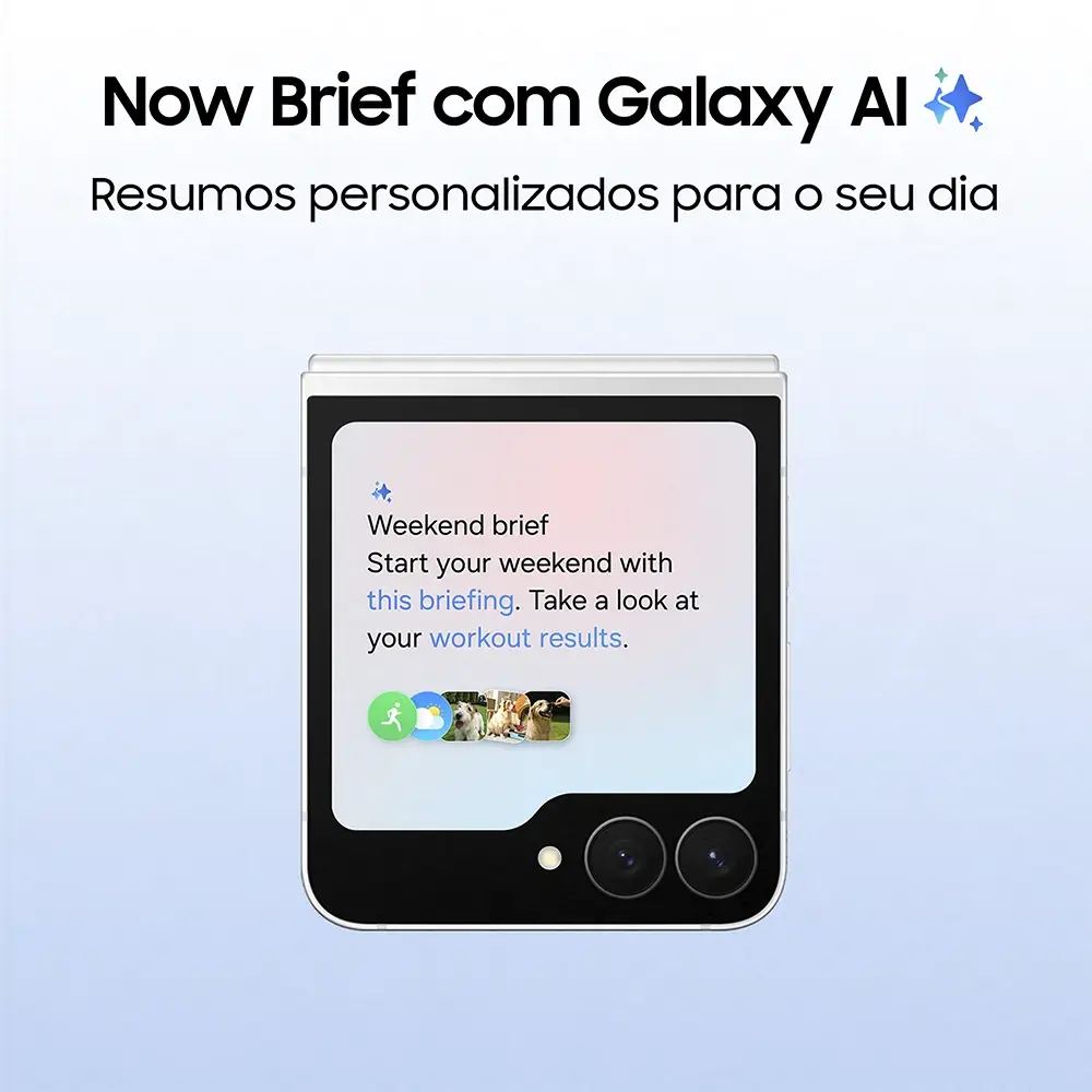 Apresentamos o novo Galaxy Z Flip FE com o design mais icónico e compacto da série Z Flip. Aceda a funcionalidades inteligentes como o Gemini ou a Now Bar diretamente a partir do Ecrã Exterior, sem necessidade de abrir o dispositivo. Tire uma foto, aponte com a sua câmara para resolver dúvidas ou partilhe o seu ecrã para que o Gemini Live o ajude. E com a FlexCam, consiga as suas melhores selfies.