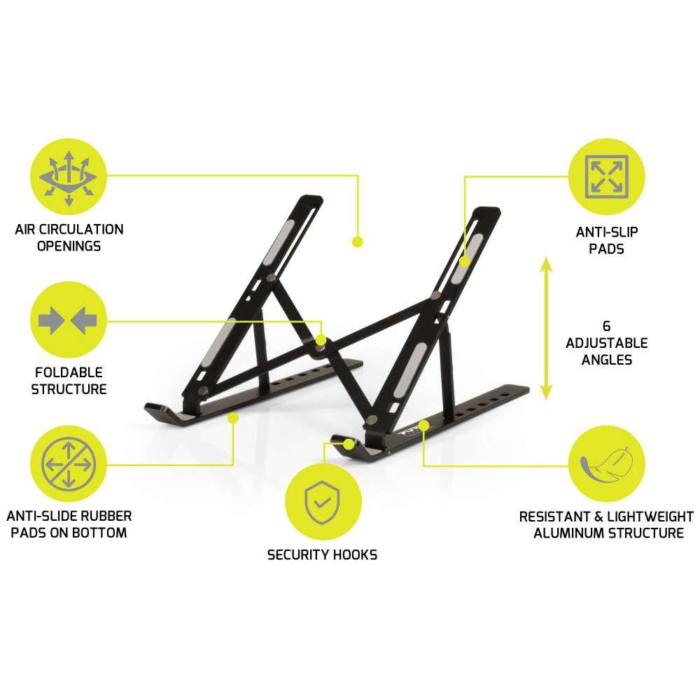 Este produto é um suporte para portáteis ergonómico dobrável, compatível com modelos de 10″ a 15.6″. Ganchos de segurança e almofadas antideslizantes evitam que o dispositivo caia do suporte.