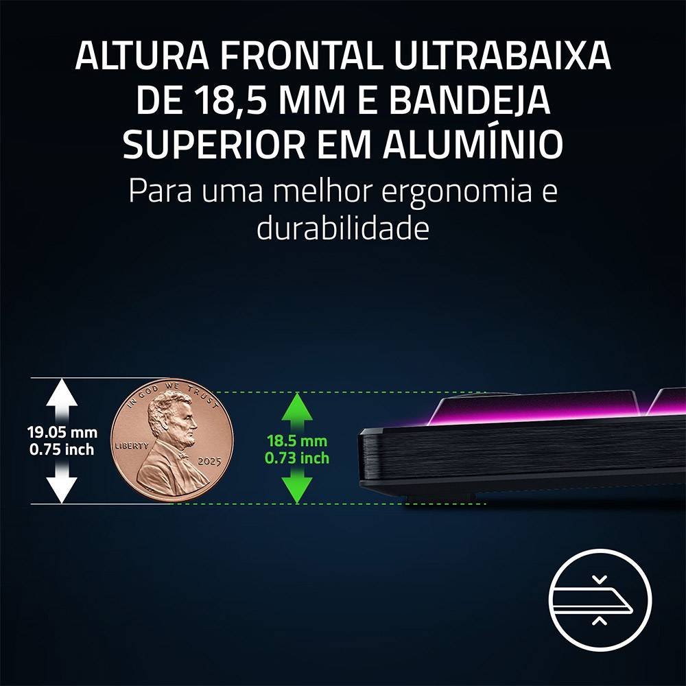 Obtenha o máximo de impacto na estação de batalha, mantendo uma silhueta minimalista. Conheça o Razer BlackWidow V4 Low-profile HyperSpeed — um teclado de gaming ultrafino e sem fios que é o pacote completo. Jogue sem atrasos com a ligação sem fios ultrarrápida de 2.4 GHz e pode até emparelhar um rato Razer compatível com o mesmo dongle através do suporte para vários dispositivos. Alcance níveis mais elevados de eficiência multitarefa alternando entre 3 dispositivos Bluetooth e simplifique o seu controlo com um rolo clicável, botões dedicados de multimédia e conectividade para gerir música, dispositivos e avisos de IA, bem como 4 botões macro especializados para otimizar a jogabilidade. A altura frontal ultrabaixa de 18.5 mm proporciona uma experiência incomparável de digitação e jogo sem esforço durante horas e horas, e o teclado está totalmente equipado com uma caixa superior em alumínio sólido para maior durabilidade e uma sensação premium. Apesar do perfil baixo, os estabilizadores lubrificados, em conjunto com espumas de amortecimento duplo, proporcionam teclas limpas para um som e uma sensação de digitação melhorados. Para completar, teclas texturizadas de PBT com dupla injeção, mais resistentes e duráveis que as de ABS, mantendo o seu acabamento irrepreensível com legendas otimizadas para promover uma maior iluminação de fundo. Jogue até 980 horas com uma única carga com o Modo de Poupança de Energia, facilmente acessível através de um atalho dedicado.