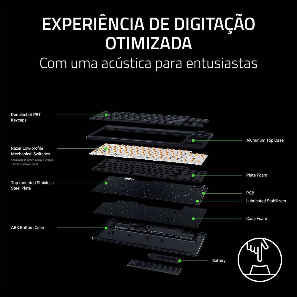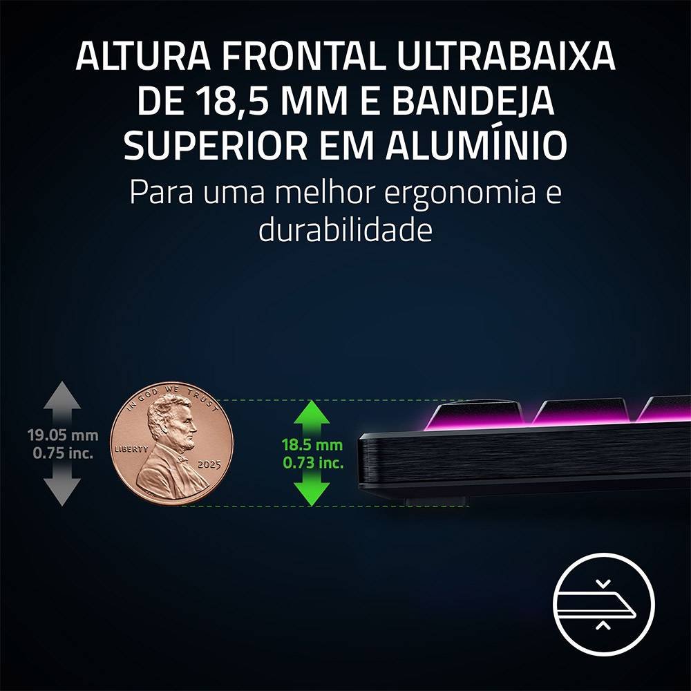 Obtenha o máximo de impacto na estação de batalha, mantendo uma silhueta minimalista. Conheça o Razer BlackWidow V4 Low-profile Tenkeyless HyperSpeed — um teclado de gaming ultrafino e sem fios que é o pacote completo. Jogue sem atrasos com a ligação sem fios ultrarrápida de 2.4 GHz e pode até emparelhar um rato Razer compatível com o mesmo dongle através do suporte para vários dispositivos. Alcance níveis mais elevados de eficiência multitarefa alternando entre 3 dispositivos Bluetooth e simplifique o seu controlo com um rolo clicável, botões dedicados de multimédia e conectividade para gerir música, dispositivos e avisos de IA, bem como 4 botões macro especializados para otimizar a jogabilidade. A altura frontal ultrabaixa de 18.5 mm proporciona uma experiência incomparável de digitação e jogo sem esforço durante horas e horas, e o teclado está totalmente equipado com uma caixa superior em alumínio sólido para maior durabilidade e uma sensação premium. Apesar do perfil baixo, os estabilizadores lubrificados, em conjunto com espumas de amortecimento duplo, proporcionam teclas limpas para um som e uma sensação de digitação melhorados. Para completar, teclas texturizadas de PBT com dupla injeção, mais resistentes e duráveis que as de ABS, mantendo o seu acabamento irrepreensível com legendas otimizadas para promover uma maior iluminação de fundo. Jogue até 980 horas com uma única carga com o Modo de Poupança de Energia, facilmente acessível através de um atalho dedicado.